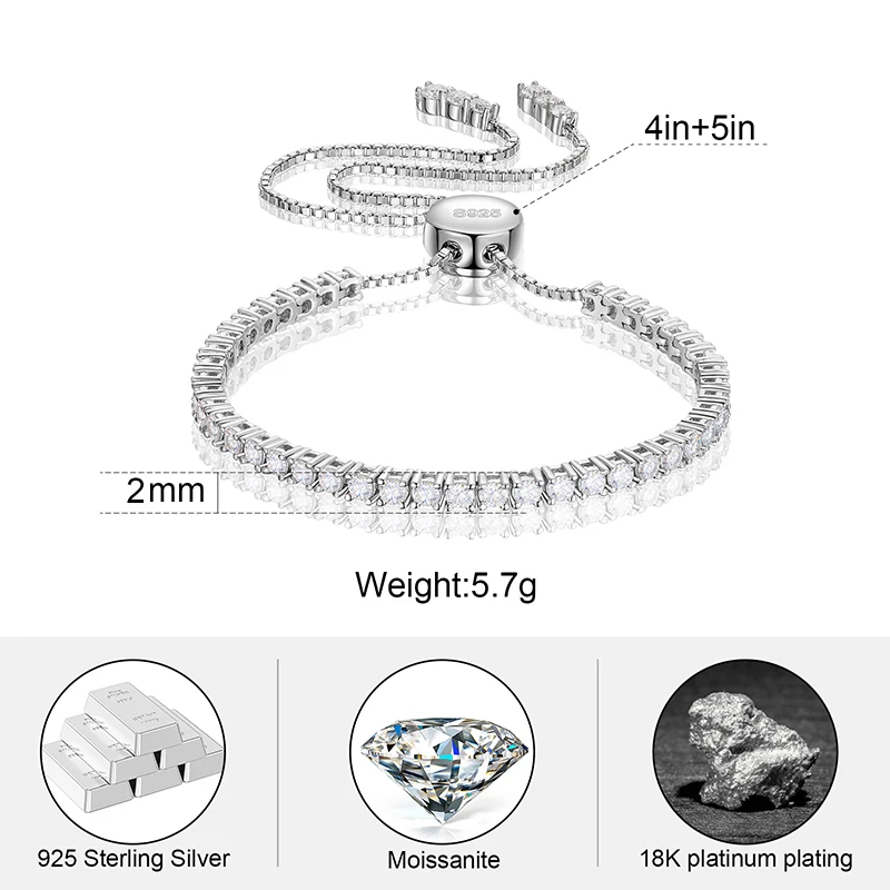 πβ¨ 925 Sterling Silver Moissanite Tennis Bracelet β Adjustable 2/3mm D VVS β¨π