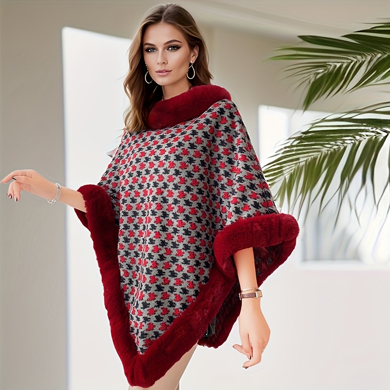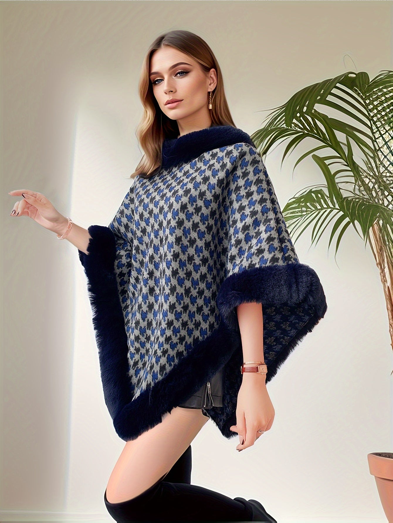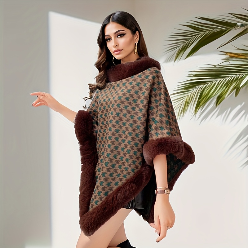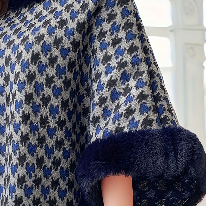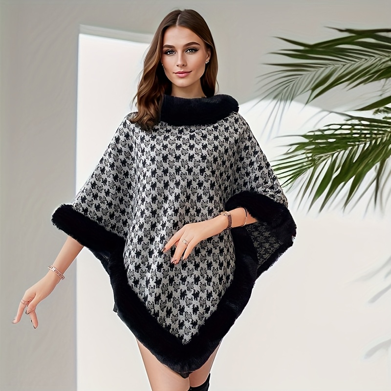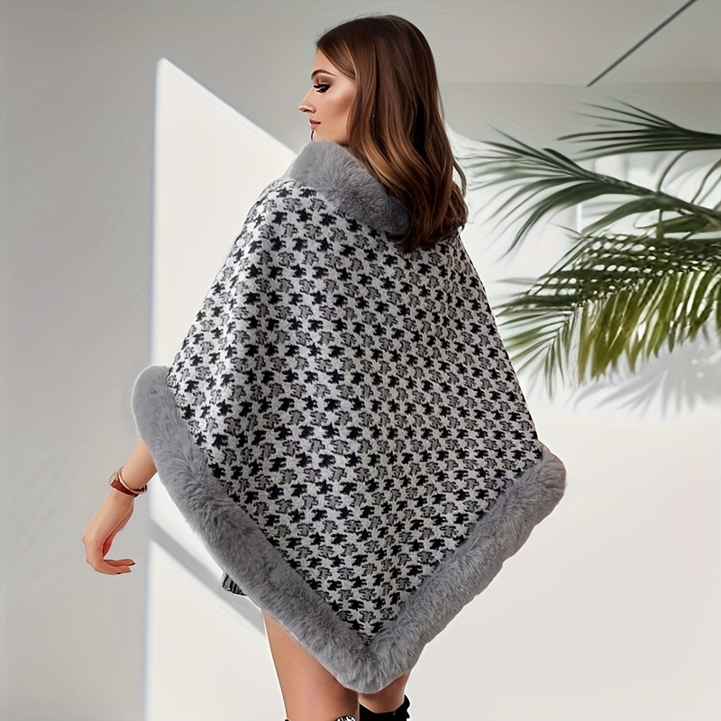 ✨ Women’s Houndstooth Cape-Style Poncho Coat – Faux Fur Trim Short Winter Wrap ❄️🧥 Elegant Black & White Warm Shawl for Fall & Winter 🍂❄️ Middle Eastern–Inspired Cape Design for Chic, Luxurious Style ✨